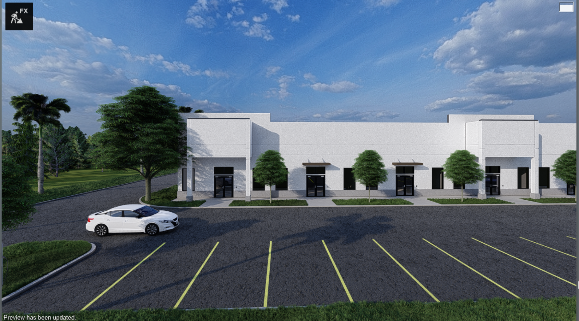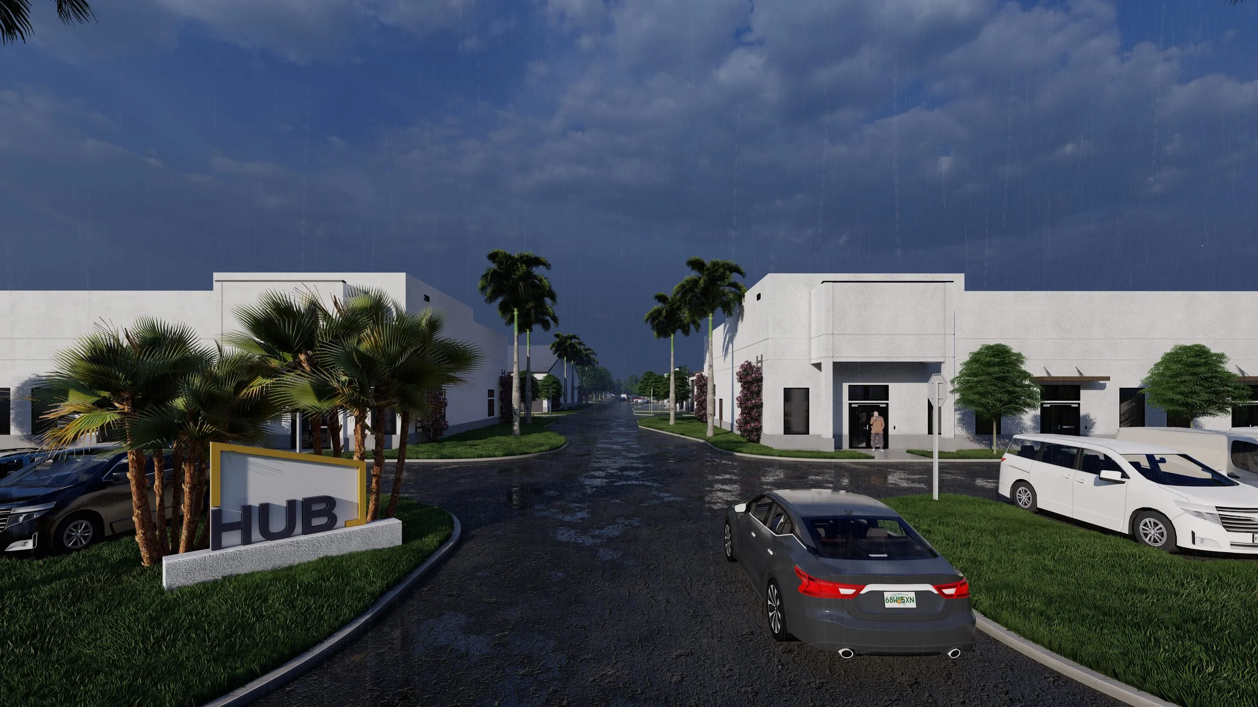 This proposal presents 3D modeling completed in Revit based on CAD drawings, with hyper-realistic rendering in Lumion. The visuals showcase industrial warehouses in a tropical setting, featuring wet pavement, perimeter vegetation, and optimized logistics access.